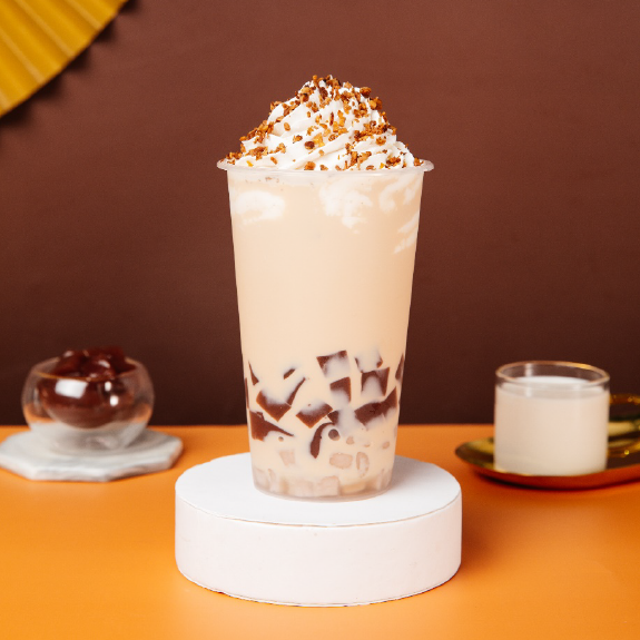 晶花奶基底、晶花红豆冻、佳芝味金黄糖浆、伯爵茶水、热水、芋圆、奶油雪顶、核桃碎