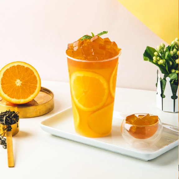 晶花茉莉花茶水、佳芝味甘蔗糖浆、黑枸杞冻、甜橙果汁、甜橙片、柠檬片、热水