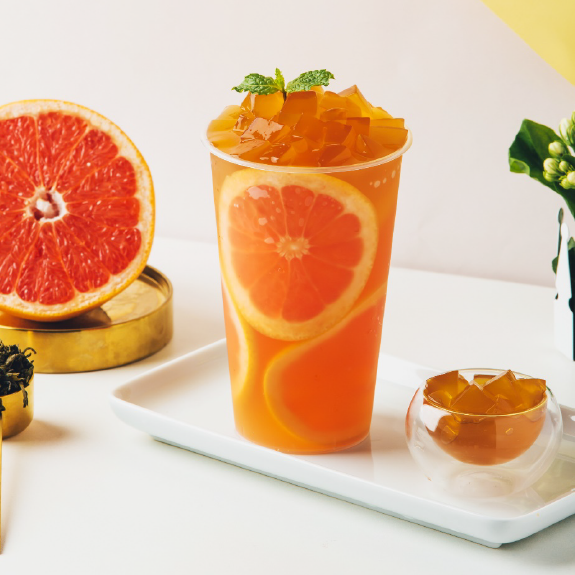 晶花茉莉花茶水、佳芝味甘蔗糖浆、西柚果汁、柠檬片、热水、茉莉花茶冻